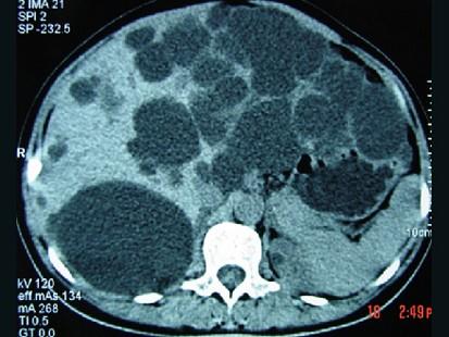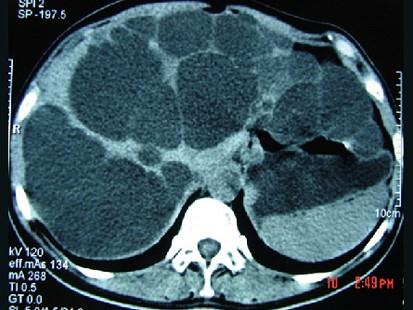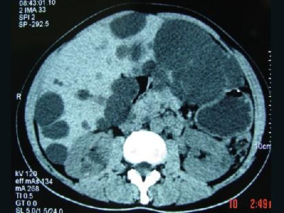 选项 A、肝脓肿并肾囊肿 B、多发性肝囊肿并多发性肾囊肿 C、多囊肝并肾多发囊肿 D、肝淋巴管瘤并多发性肾囊肿 E、先天性肝内胆管扩张并多囊肾