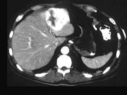男,40岁,中上腹胀疼不适,CT扫描如图,最佳的诊断为 ( )A、肝血管瘤B、肝血管内皮瘤C、胆管细胞癌D、肝转移瘤E、原发性肝癌
