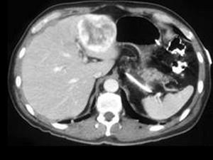 问题 男,40岁,中上腹胀疼不适,CT扫描如图,最佳的诊断为 ( )