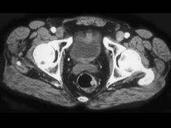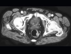 问题 男性,41岁,血便,肛诊触及左侧直肠壁一质硬小结节,结合CT所见应考虑为 ( )