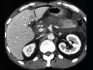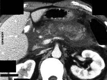 问题 女,45岁,急性上腹部持续性疼痛,程度剧烈,放射到胸背部,恶心、呕吐,白细胞计数增高,血尿淀粉酶升高,影像所见如图,最可能的诊断是 ( )