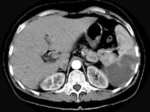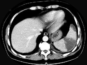 女、54岁,左上腹痛,CT检查如图,最可能的诊断是 ( )A、脾血管瘤B、脾转移瘤C、脾脓肿D、脾梗死E、脾淋巴瘤