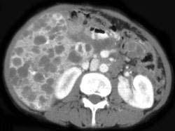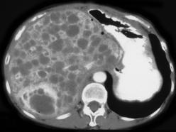 男,36岁,上腹部胀痛,CT检查如图所示,最可能的诊断是 ( )A、肝脓肿B、肝囊虫病C、肝癌D、多囊肝E、肝转移癌