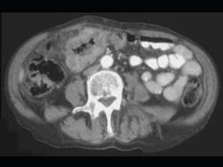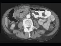 问题 男,45岁,右下腹胀痛、并可触及质硬包块,请结合图像选择最可能诊断 ( )