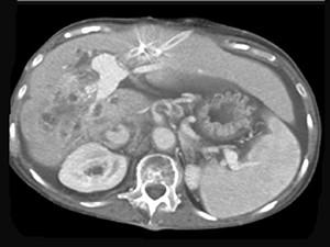 男,50岁,右上腹痛,进行性黄疸,无腹部包块,AFP阴性,影像检查如图,最可能的诊断是 ( )A、肝腺瘤B、肝转移瘤C、胆管癌D、肝血...