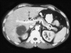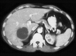 女,58岁,肝区疼痛半月,发热,白细胞升高,CT检查如图,请选择最可能诊断 ( )A、肝转移瘤B、肝棘球蚴病C、肝囊肿D、肝脓肿E...