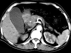 问题 男50岁黄疸进行性加重、腹部胀痛不适、食欲减退、体重减轻、上腹部可触及肿块,CT如图,最可能的诊断为 ( )