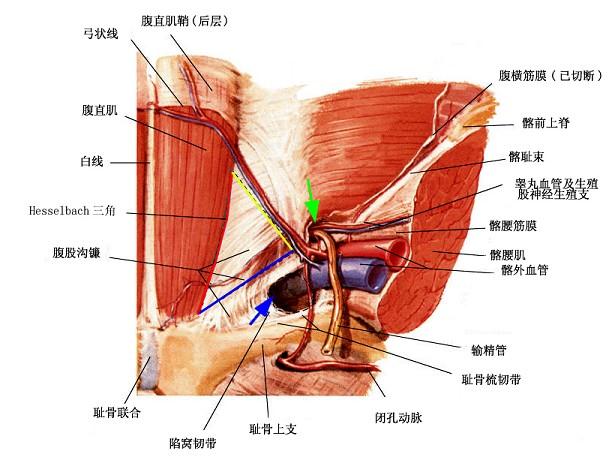 这是一张腹股沟区直疝三角(Hesselbach三角)解剖示意图:构成三角蓝色边的是 ( )A、腹直肌外侧缘B、腹股沟镰C、腹壁下动脉D...