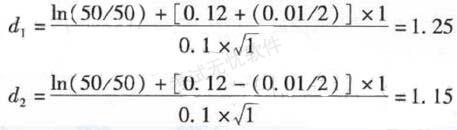 解析 已知:S=50美元;K=50美元;T=1年:r=0.12;σ=0.1。 则, N(d1)=0.8944 N(d2)=0.8749 如此,欧式看跌期权的理论价格为: P=50x(1-0.8749)e-0.121×1-50×(1-0.8944)=0.27(美元)