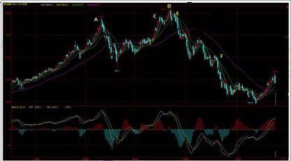 下图为美豆的K线和MACD指标图。投资者由期货行情图可以推断()。 A 相对于A和D两个高点,出现MACD指标顶背离 B 相对于A和D两个高点,出...