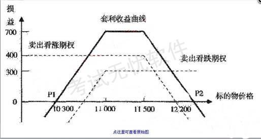 解析 本题为卖出宽跨式套利。卖出的总权利金为300+400=700.而图中P1和P2分别为10300和12200,因此,看涨期权的执行价格,即高执行价格=P2-权利金=12200-700=11500;而看跌期权的执行价格,即低执行价格=P1+权利金 =10300+700=11000.