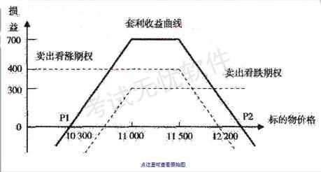解析 该图属于卖出宽跨式套利,投资者同时卖出相同标的物、相同到期日、但不同执行价格的看涨期权和看跌期权。