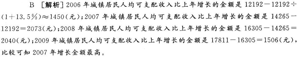 问题 2011年,我国农村居民人均工资性收入3715元,增长25.6%;农村居民人均生活消费支 出5901元,增长22.7%,其中,食品支出2107元,增长16.8%。 2011年,城镇居民人均工资性收入17629元,增长12.1%,城镇居民人均消费性支出 14561元,增长11.0%,其中,食品支出4828元,增长14.8%。 城镇居民人均可支配收入在下列哪一年增长金额最高?( ) A. 2006 年 B. 2007 年 C. 2008 年 D. 2009 年