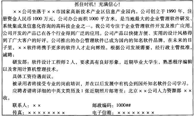 公司在发行量超过100万份的某报纸上刊登招聘广告如下: 请回答下列问题: (1)这则招聘广告有哪些不合理的地方? (2)在原有基細上重新设计这则...
