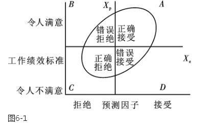 如果把预测因子的分数与工作绩效标准的分数进行对照可绘制成图6-1(其中A、B、C、D是每种决策类型中的人数),那么在录用决策时,用人部门的经理通常最关心的...