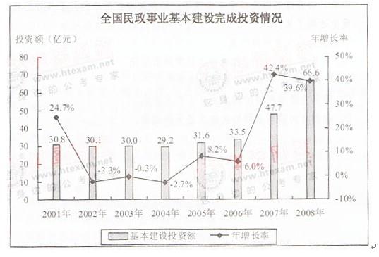 2008年,全国民政事业基本建设完成投资总额为66.6亿元,施工项目为3906个,完成投资总额比上年增长39.6%。其中国家投资26.6亿元,比上年增长8...