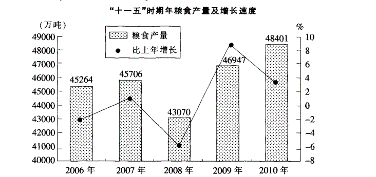 2009年粮食产量比2008年提高了()个百分点。A.9 B.3.1C.l D.-2.1
