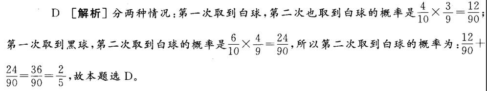 问题 一个袋子里有10个小球,其中4个白球,6个黑球,无放回地每次抽取1个,则第二次取到白球的概率是多少?( )