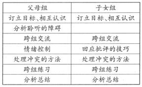 在某少年宫工作的社会工作者小刘,为一些存在亲子冲突的家庭设计了亲子平行沟通小组。以下表格所列的上组活动计划中,与父母组的“分析聆听的障碍”活动相对的应该是...