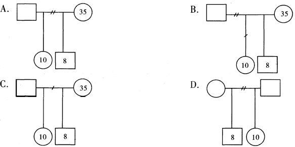 问题 阿丽今年35岁,因性格不合,与丈夫离婚。目前,她一个人带着8 岁的儿子在城市打工,把10岁的女儿留给了丈夫。根据上述案例介绍,社会工作者绘制的家庭结构图中正确的是( )。
