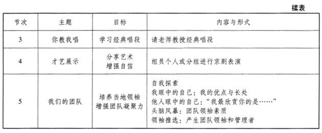 小组模式:互动模式。通过组员之间、组员与小组及社会环境之间、小组与社会环境的互动关系,促使组员在小组这个共同体的相互依存中,不仅提高京剧艺术水平,更增强组员的社会功能,提升其发展能力。