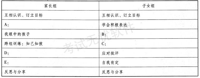 解析 1. 亲子沟通平行小组的优点有: (1) 父母参与的中介角色对子女学习各种技巧有很大的帮助。通过服务参与可促使父母成为培训者,由于父母清楚了解小组的内容,在子女学习上,他们可以发挥提醒和鼓励作用,并且协助子女在家完成小组“布置”的实践练习。 (2) 由于双方都参与亲子沟通平行小组的活动,从中会让子女感受到改变不是单向的,也并不是只有子女沟通方式不足才造成亲子关系不良。父母也愿意努力学习改善关系,而彼此在服务活动过程中的改变和进步,都会给对方以鼓励,从而增强亲子双方处理冲突和解决问题的信心。 (3) 通过参加亲子平行小组活动,孩子的自信心和人际沟通技巧能够得到很大改善。父母通过参加亲子平行小组,不仅增进了彼此的沟通和交流,也重新开始构建良好的家庭关系。 2. 结合案例完成亲子沟通平行小组主题内容的设计,如下: A:学会积极聆听 B:我眼中的父母 C:跨组训练:知己知彼 D:管理不良情绪,学习正确的批评方式 E:发现和肯定(孩子的)闪光点