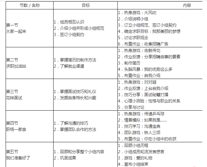 解析 (1)问题的陈述与分析 通过对求职情况的调查和分析可以发现,该社区青少年在求职过程中面临的普遍困难包括以下几个方面: ①学历偏低,就业技能较差; ②缺乏工作经验,实际动手能力及解决问题能力差; ③就业态度上存在一定的偏差,眼高手低,缺乏吃苦耐劳的精神; ④普遍缺乏求职技能,获取求职信息的渠道不畅通。 基于以上分析,社区青少年求职可能存在以下的需求: ①求职技巧及实际劳动技能培训的需求; ②了解自身特点与培养职业兴趣的需求; ③了解求职渠道与人力资源市场的需求; ④学习和改善沟通能力以及认识了解真实工作世界的需求。 (2)方案设计 针对案例情况,社会工作者可在社区内开展一次“我的第一份工作”的小组活动,方案如下: ①小组名称:“我的第一份工作”。 ②小组工作目标: a.总目标:帮助社区青少年了解自身特点,提高求职能力,选择合适的工作岗位; b.具体目标:了解自身的人格特点和兴趣;求职简历的制作;面试技巧的学习和训练;了解和利用社会的各种求职渠道;学习和训练团队合作精神;设计初步的就业目标以及相应的职业计划。 ③小组性质及特征:教育成长型小组。 ④小组成员特性:社区内16~25岁、有较强求职意愿的无业青少年。 ⑤小组成员人数:8人。 ⑥小组成员招募方法:张贴海报、派发宣传单、网站招募等。 ⑦小组执行计划(见表4—5)。 表4—5 ⑧方案执行。 涉及整合社区资源、提供服务、监督服务执行进度、处理危机等。 ⑨方案评估。 a.小组过程评估,由小组成员填写评估表,在小组活动执行过程中进行评估; b.小组成员满意度评估,由小组成员对小组进行成效评估; c.社会工作者的小组报告,以及社会工作者的反思。