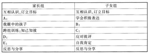 解析 1.亲子沟通平行小组是亲子教育的一种新形式,它可以定义为两个分开但同时进行的小组,通过联合活动,如实践练习、互相配合的小组内容和进度、联组活动等,从而改善亲子关系。 亲子沟通平行小组的优点: (1)父母参与的中介角色对子女学习各种技巧有很大的帮助。由于父母清楚地了解小组的内容,在子女学习上他们可以发挥提醒和鼓励作用,并协助子女在家完成实践练习。 (2)由于双方都参加亲子教育服务活动,从中会让子女感受到父母也愿意努力学习改善关系,而彼此在服务活动过程中的改变和进步都会成为对对方的鼓励,从而增强双方处理冲突和解决问题的信心。 2.亲子沟通平行小组内容的选择和设计: 在小组活动正式开始之前,首先应该对服务对象(家长和子女)的需要和问题做一个了解和评估,家长组方面是需要增强聆听能力,情绪管理能力;子女组重点是训练他们增强表达能力,提升自我价值。 A:学会认真聆听 B:我眼中的父母 C:跨组练习:知己知彼 D:心平气和之道 E:学会情绪管理