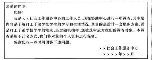 解析 问卷有一定的内容结构:(1)标题;(2)封面信;(3)指导语;(4)问 题和答案;(5)编码;(6)其他。其中封面信,旨在说明调查者的身份、研究目的和内容、对 象选择方法、保密原则、并署名研究机构。