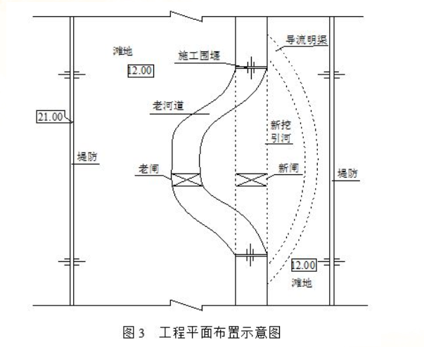 相关内容:水闸,加固,工程,内容包括,老闸,开挖,引河,新闸,设计,流量,1100m3,平面,示意图,如图,3所示,施工,合同,约定