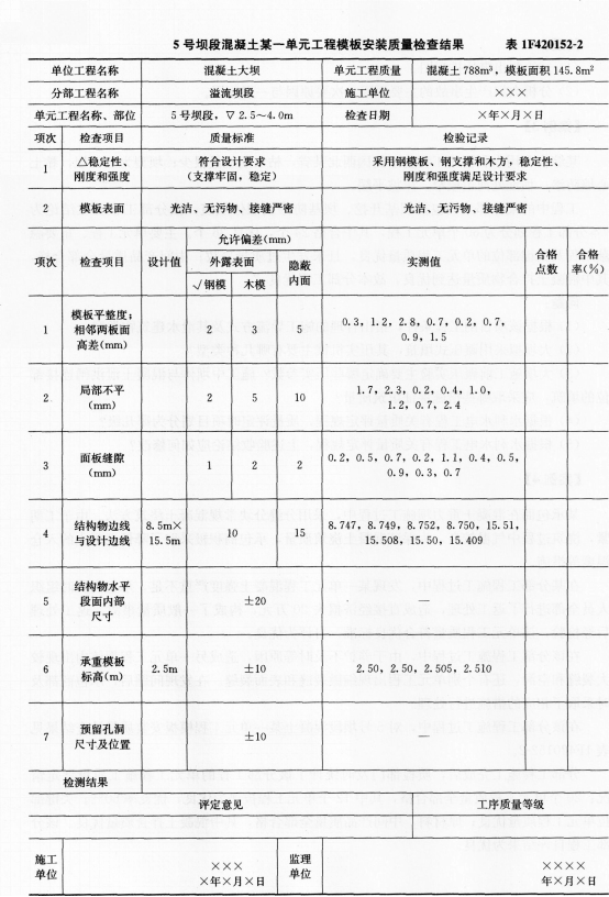 问题 某承包商在混凝土重力坝施工过程中,采用分缝分块常规混凝土浇筑方法。由于工期紧,浇筑过程中气温较高,为保证混凝土浇筑质量,承包商积极采取了降低混凝土的人仓温度等措施。 在某分部工程施工过程中,发现某一单元工程混凝土强度严重不足,承包商及时组织人员全部进行了返工处理,造成直接经济损失20万元,构成了一般质量事故。返工处理后经检验,该单元工程质量符合优良标准,自评为优良。 在该分部工程施工过程中,由于养护不及时等原因,造成另一单元工程坝体内出现较大裂缝和空洞,还有个别单元工程出现细微裂缝和表面裂缝。在发现问题后,承包商都及时采取了相应的措施进行处理。 在该分部工程施工过程中,对5号坝段混凝土某一单元工程模板安装质量检查结果见表1F420152—2。 分部工程施工完成后,质检部门及时统计了该分部工程的单元工程施工质量评定情况:20个单元工程质量全部合格,其中12个单元工程被评为优良,优良率60%;关键部位单元工程质量优良;原材料、中间产品质量全部合格,其中混凝土拌合质量优良。该分部工程自评结果为优良。 问题: (1)在大体积混凝土浇筑过程中,可采取哪些具体措施降低混凝土的入仓温度 (2)对上述混凝土内外部出现的不同裂缝可采取哪些处理措施 (3)上述经承包商返工处理的单元工程质量能否自评为优良 为什么 (4)根据混凝土模板安装质量检查检测结果,指出该工序的施工质量等级并说明理由。