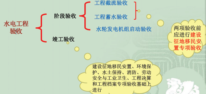 解析 问题1 指出水电站建设工程按验收工作内容分为哪些? 问题2 指出事件1、事件2中有何不妥之处,并说明理由。 事件1:该施工企业在建设工程中主持验收了工程截流验收、工程蓄水验收、水轮发电机组启动验收等验收。 事件1不妥之处有三处: 一是工程截流验收应由该施工企业与县政府共同组建的项目法人会同工程所在地省级发展改革委、能源局共同组织验收委员会进行; 二是工程蓄水验收应由国家能源局负责,并委托有资质单位作为验收主持单位,会同工程所在地省级发展改革委、能源局共同组织验收委员会进行; 三是水轮发电机组启动验收应由该施工企业与县政府共同组建的项目法人会同电网经营管理单位共同组织验收委员会进行。 事件2:经该地方县水利局同意,不进行库区移民专项验收。 事件2不妥之处: 库区移民专项验收需由省级政府有关部门会同项目法人组织库区移民专项验收委员会进行,而非由县政府决定不进行该专项验收。 问题3 竣工验收分为哪些专项验收? 问题4 指出本工程竣工验收的责任单位。竣工验收委员会由哪些单位组成? 竣工验收负责单位:国家能源局