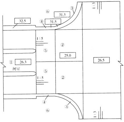 某水闸共3孔,闸室每孔净宽8.0m,主要工程内容包括:①闸底板和闸墩;②消力池;③消力池段翼墙;④斜坡段翼墙;⑤斜坡段护底;⑥翼墙后填土等。闸室底板与斜坡段底板混凝土分缝之间设金属止水片。其工程平面布置示意图如下。