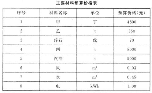 1.甲、乙、丙、丁、戊所代表的材料或单位名称分别为:钢筋、水泥、柴油、t、m3。还需搜集以下材料:黄砂、块石、木材。