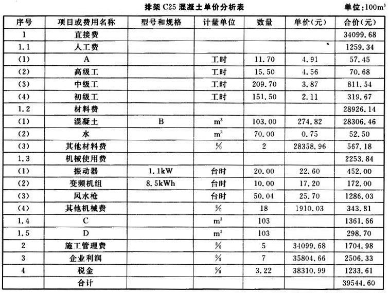 2.指出排架C25混凝土单价分析表中,A.B、C、D所代表的名称(或型号规格)。