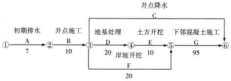 承包人承担某水闸工程施工,编制的施工总进度计划中相关工作如下:①场内道路,②水闸主体施工,③围堰填筑,④井点降水,⑤材料仓库,⑥基坑开挖,⑦地基处理,⑧办公、生活用房等。监理工程师批准了该施工总进度计划。其中部分工程施工网络进度计划如下图所示(单位:天)。