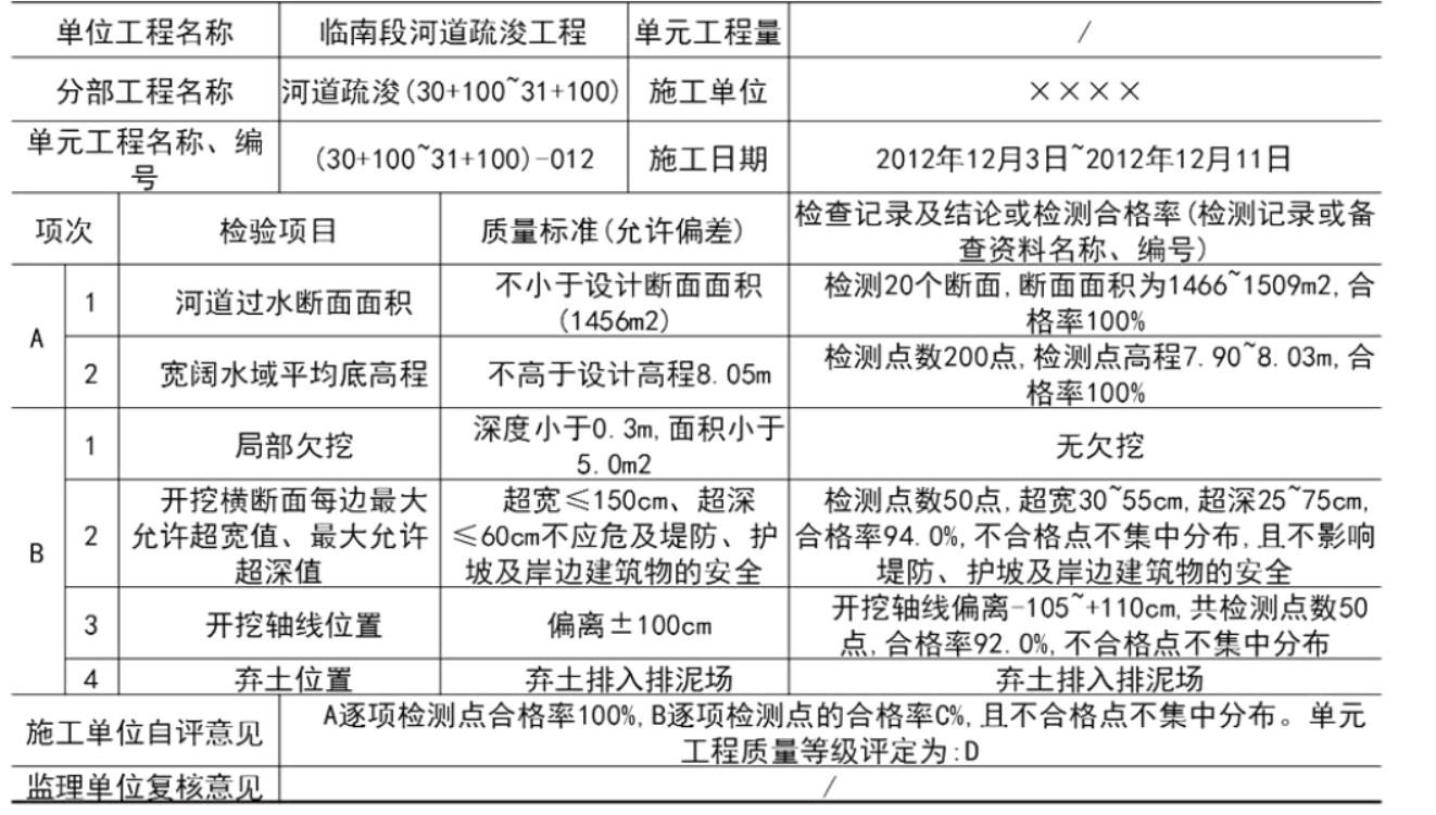 背景资料:临南段河道疏浚工程,疏浚河道总长约5km,设计河道底宽150m,边坡1∶4,底高程7.90~8.07m。该河道疏浚工程划分为一个单位工程,包含7...