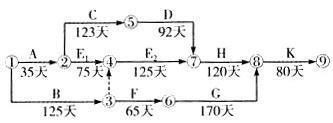 关键线路之一:①→③→④→⑦→⑧→⑨(或B→E2→H→K)关键线路之二:①→②→⑤→⑦→⑧→⑨(或A→C→D→H→K)