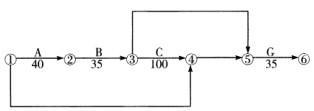 本案例第1问主要考查绘制网络计划的逻辑关系。D工作没有紧前工作,且E工作的紧前工作为C、D工作,故①→④为D工作;F工作的紧前工作为B工作,且G工作的紧前工作为F工作,故③→⑤为F工作;E工作紧前工作为C工作和D工作,且G工作的紧前工作为E工作,故④→⑤为E工作。持续时间见逻辑关系表。