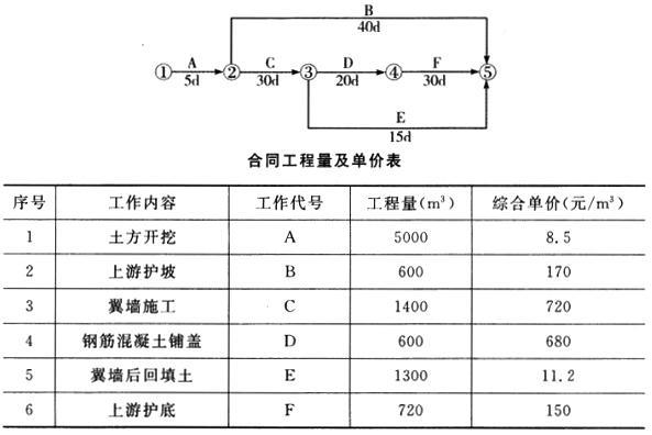 某水闸上游连接段分部工程施工进度计划如下图所示,对应合同工程量及单价见下表。