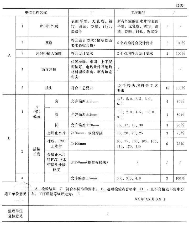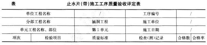 事件2:穿堤涵洞第五节涵身施工过程中,止水片(带)施工工序质量验收评定如下表所示: