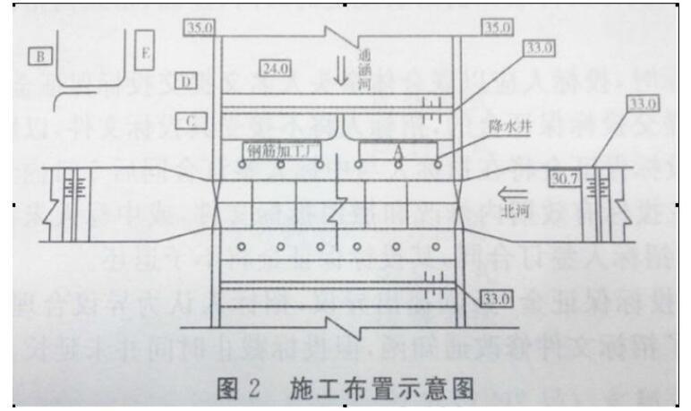 问题 背景资料: 某立交地涵工程主要由进口控制段、涵身、出口段等部分组成,涵身共有 23 节,每节长 15m,涵身剖面 如图 1 所示 涵身地基采用换填水泥土处理,水泥土的水泥掺量为 6%,地基承压含水层承压水位为 23.0m,基坑采用深井降水。施工采用一次性拦断河床围堰导流。在河道上下游各填筑一道均质土围堰,并安排在一个非汛期(2010 年 9 月一 2011 年 5 月)内完成地涵施工。施工布置是示意图如图 2 所示。 施工中发生如下事件: 事件 1:根据本工程具体特点,施工单位进场后,对工程施工项目进行了合理安排。工程主要施工项目包括:①涵身施工,②干砌石河底护底,③排水清淤,④土方回填,⑤降水井点,⑥围堰填筑,⑦基坑开挖。 事件 2:根据工程施工需要,施工单位在施工现场布置了生活区、钢筋加工厂、混凝土拌合站、油库、木工加工厂、零配件仓库等生产生活设施,如图 2 所示。 事件 3:本工程项目划分为一个单位工程, 11 个分部工程。第 3 段涵身分部工程共有 56 个单元工程,其中 26 个为重要隐蔽单元工程; 56 个单元工程质量全部合格,其中 43 个单元工程质量优良(21 个为重要隐蔽单元工程);该分部工程的其他质量评定内容均符合优良标准的规定。 事件 4:本工程闸门、启闭机制造与安装为个合同标, 2011 年 9 月 16 日通过了该合同工程完工验收,并颁发合同工程完工证书;本工程 2012 年 12 月 8 日通过了竣工验收,项目法人于 2012 年 12 月 20 日向该合同承包商退还了履约担保和质量保证金。 <1>、指出事件 1 中主要施工项目的合理施工顺序(用工作编号表示)。 <2>、指出事件 1 中涉及施工安全的最主要的两项工程施工项目。 <3>、根据事件 2,指出图 2 中 A、 B、 C、 D、 E 对应的生产生活设施名称。 <4>、根据事件 3,评定第 3 段涵身分部工程的质量等级,并说明理由。 <5>、根据《水利水电工程标准施工招标文件》 <2009 年版),改正事件 4 中项目人退还履约担保和质量保证金的不妥之处。