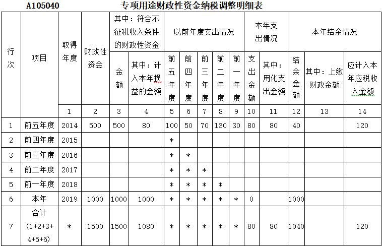 该公司取得的专项资金均符合不征税收入的条件,2014年取得专项资金通过“递延收益”核算,至2019年12月31日第一笔(2014年)取得的专项资金剩余部分未上缴给拨付单位。公司2019年度取得的专项资金全额计入当期“其他收益”科目核算,当年未发生支出。 要求:根据上述资料,填报2019年度企业所得税申报表。