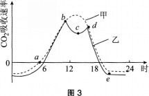 夏季晴朗的一天,甲乙两株同种植物在相同条件下,CO2吸收速率的变化如图3所示。下列说法正确的是(  )。 A.甲植株在a点开始进行光合作用 B....