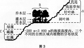 问题 如图3,A、B、C分别代表山地、森林、海洋三个不同的自然区域内植物的分布状况。据此判断下列选项中正确的是(  )。