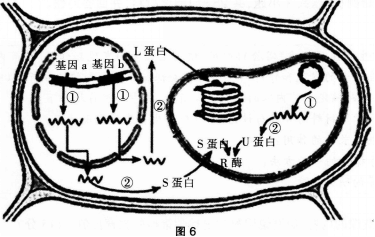 问题 某植物在日光照射下,叶肉细胞中发生的一系列化学反应如图6所示: (1)过程①是__________,过程②发生在位于__________的游离核糖体上。(6分) (2)L蛋白合成后转移至类囊体上发挥作用,影响与之相关的光合作用过程的主要环境因素是__________。(3分) (3)图中的S蛋白和U蛋白组成R酶,说明R酶的合成受__________内基因的共同控制。从其分布位置推断,R酶与光合作用__________阶段有关。(6分)