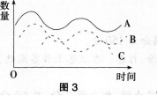 问题 图3是某一生态系统在一定时间内,三个种群(A、B、C)数量变化曲线(A是自养生物)。 据图回答: (1)