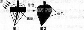 解析 本题通过图示的对照实验,考察光是光合作用的条件,淀粉是光合作用的产物。甲图叶片中通过锡箔形成了一组有光和无光的对照实验;乙图中,见光部分遇碘变蓝,说明在光下叶片进行光合作用制造了淀粉。