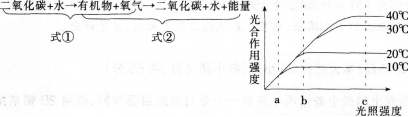 解析 (1)光合;叶绿体 (2)有机物 (3)光照强度:温度 解析: (1)过程①,二氧化碳+水一有机物+氧,表示的是植物的光合作用,进行的场所是在细胞质的叶绿体中。 (2)式②中表示的是细胞的有氧呼吸作用,其能量来源是式①中的有机物。 (3)根据图示可知:光照强度越强,温度越高,光合作用的强度就越大。