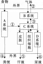 材料: 代谢与平衡的一道试题分析 试题:下图是人体消化、吸收、循环及排泄等生理活动示意图,其中的A、B、C、D表示人体的几大系统。①、②、③、④、...